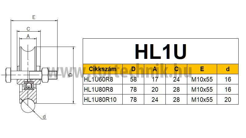 Tolókapu kerék O profillal Ø60/16mm, szimpla csapágyas, horganyzott.